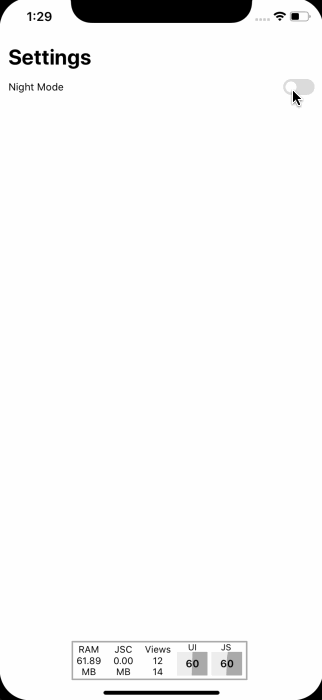 <Div bg="body" flex={1} px="lg"> <Text mt="2xl" pt="xl" fontSize="5xl" color="text" fontWeight="bold"> Settings </Text> <Div row mt="md"> <Div flex={1}> <Text color="text">Night Mode</Text> </Div> <Div> <ThemeSwitcher /> </Div> </Div> </Div> </ThemeProvider>